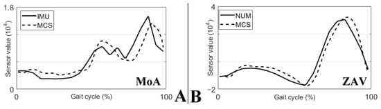 The MCS in Figure 4 converted data from the joint angles into MoA and ZAV using numerical modeling. The IMU in Figure 4 is the result of the MoA and ZAV data collected from the IMU—Figure 4A showing the MoA and Figure 4B showing the ZAV. Estimations of the MoA and ZAV from the joint angles was not significantly different from the MoA and ZAV directly collected using the IMU. Consequently, the use of numerical modeling was found to be a reasonable method for estimating gait.