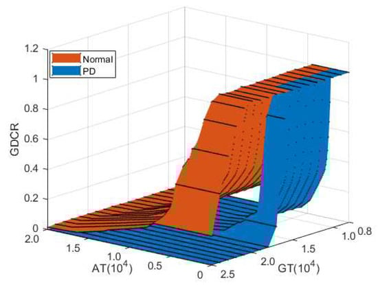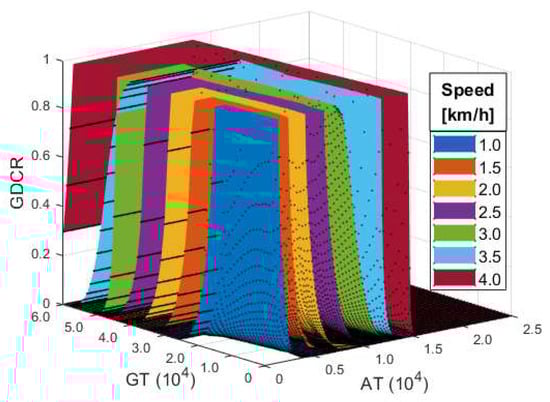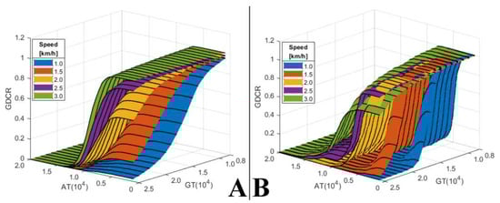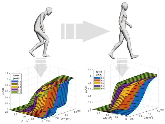 Figure 6 shows the experimental results for evaluating numerical modeling and observing the impact of a gait disorder. We could observe a pattern showing that a lower GDCR is found if the user is affected by a gait disorder. The GDCR could be reduced by a gait disorder at over 15,000 GT and 2000 AT. Similar to the gait speed effect experiments, an increase in the GT and AT reduced the GDCR. Consequently, a gait disorder could be considered to significantly affect (lower) the GDCR.