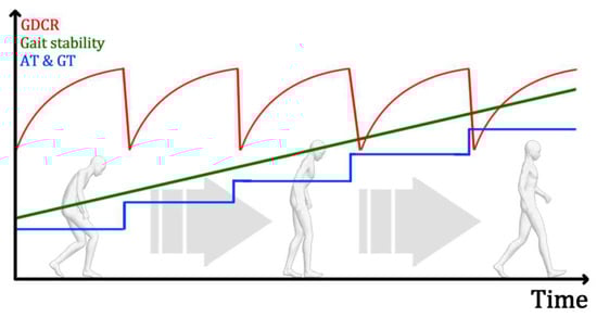 By lowering AT and GT, patients can generate appropriate GDCR at certain AT and GT, approximately 0.7~0.8 (70~80%). At the AT and GT condition, patients can do rehabilitation to increase their GDCR by receiving augmented feedback. After, the GDCR may be increased if gait symptoms are relieved as a result of rehabilitation. However, the GDCR may not be changed, or may even be decreased, if their gait performance did not improve.