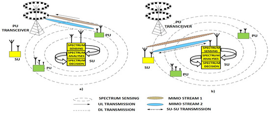 Operation of cognitive radio in MIMO communication systems for the case when (a) SU detects spectrum occupied by PU and (b) SU performs transmission due to detection of spectrum unoccupied by PU.