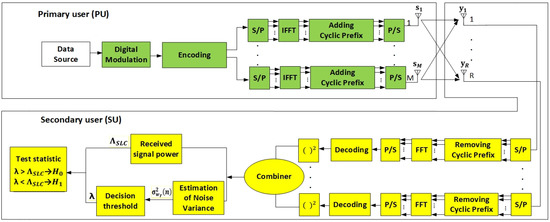 All signals transmitted by the PU from the M Tx branches can be expressed as (Figure 2). If the received signal at the r-th Rx branch (antenna) of SU is sampled with n samples (n = 1, …, N), then the received signal at each of the R Rx antennas of SU can be expressed as