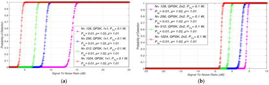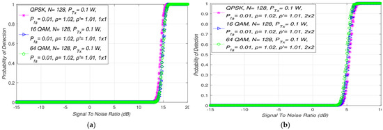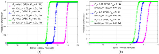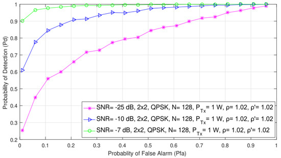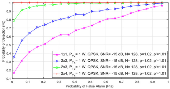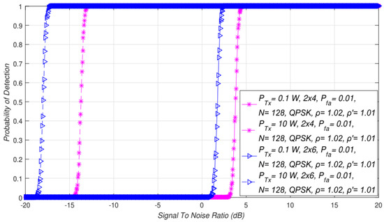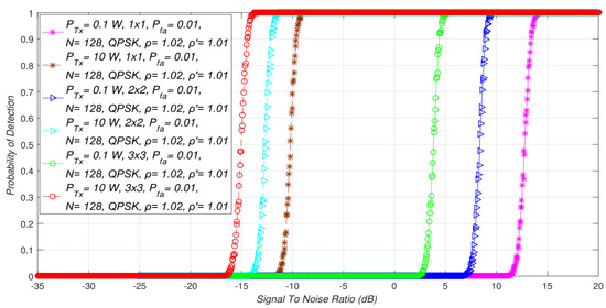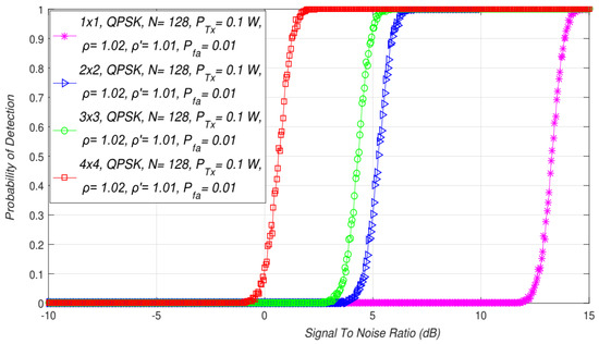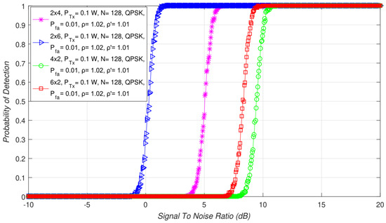 Detection probability () is the probability of detecting the PU signal at the location of the SU when it is actually present. It is verified through the fulfillment of hypothesis (). For ED using the SLC approach in MIMO systems, detection probability can be expressed as