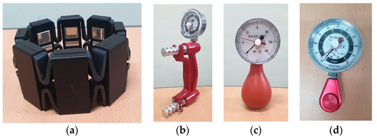 Armband-type multi-channel sEMG sensor (a) and hand dynamometers (b–d).