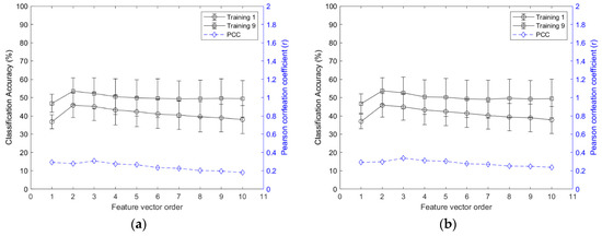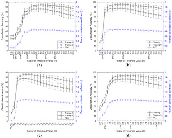 Figure 3 shows the classification accuracy and inter-session PCC of Group 1 in accordance with the threshold values (the results for the other groups are shown in Figures S1–S6). All threshold-based feature vectors showed improved classification accuracies corresponding with an increasing number of training sessions. The classification accuracy and inter-session PCC were dramatically improved by increasing the threshold value, and then maintained at the constant level. However, excessive threshold values were found to cause a degradation of the classification accuracy and inter-session PCC. The best threshold values depended on the feature vector.