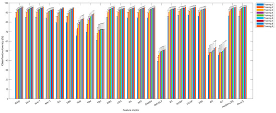 Classification accuracies of feature vectors and feature combinations according to training in Group 1.