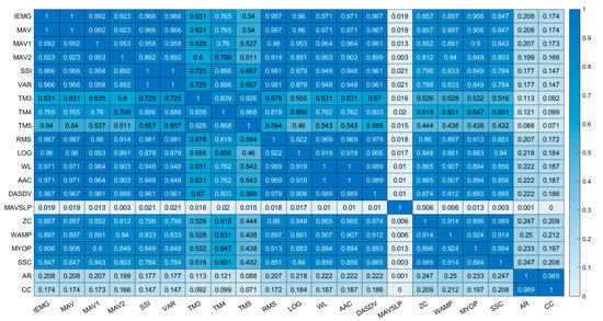 In this study, twenty-one time-domain feature vectors and two feature combinations (Hudgins’ set: MAV, WL, ZC, and SSC [38] and Du’s set: IEMG, VAR, WL, ZC, SSC, and WAMP [47]) from previous studies were applied to the ANN classifier. The classification accuracy was analyzed based on the number of training sessions and considering the electrode shift, and the PCC was calculated to analyze the linear relationship between the sessions or the feature vectors. Many previous studies suggested various methods to select the feature vectors for the improvement of the classification performance [10,12,14,15]. Correlation-based feature vector selection was primarily used to evaluate the way each feature vector is able to distinguish a gesture or verify the similarity of the information of feature vectors. In this study, the inter-session PCC was used to analyze the correlation between the sessions with the electrode shift, and the similarity of the feature vectors was analyzed by inter-feature PCC. A factor r represented the linear relationships as follows: weak linear relationship: 0 < r ≤ 0.3; moderate linear relationship: 0.3 < r ≤ 0.7; and strong linear relationship: 0.7 < r ≤ 1.0.