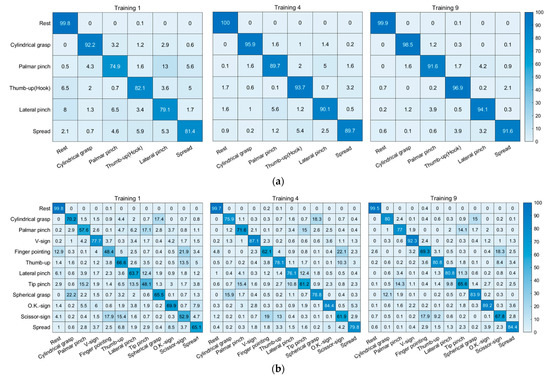 Confusion matrices of the hand postures: (a) Group 1 and (b) Group 7.