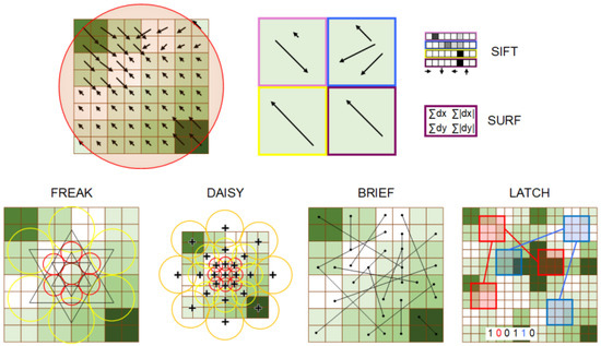 BRISK [24] combines the two approaches described previously; it selects a set of interesting points as in BRIEF, and follows the DAISY pattern, as presented schematically in Figure 1. ORB [25] applies rotation normalization, then the BRIEF patch descriptor is used to determine the binary strings describing the patch. FREAK (Fast REtinA Keypoint) [35] reflects the methods used for point selection that have already been mentioned in the previous approaches, but the point sampling corresponds to the receptive field properties of the retina. Another variation is termed LATCH (Learned Arrangements of Three Patch Codes) [36], where instead of pairs of sampled points, triplets of small patches are considered and denoted by the coefficient of the central pixel (, , ), as presented in Figure 1. The Frobenious norm () is evaluated to build the comparison, allowing one to create a binary string: