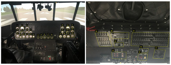 In the database, we stored images and videos of devices installed in the cockpit of a helicopter flight simulator. Figure 2 depicts the cockpit interior, where the elements of interest on the front panel (on the left) and top panel (on the right) are marked. As shown in the figure, each device selected on the front panel represents a separate class, while on the top panel one class is represented by a set of switches organized next to each other.