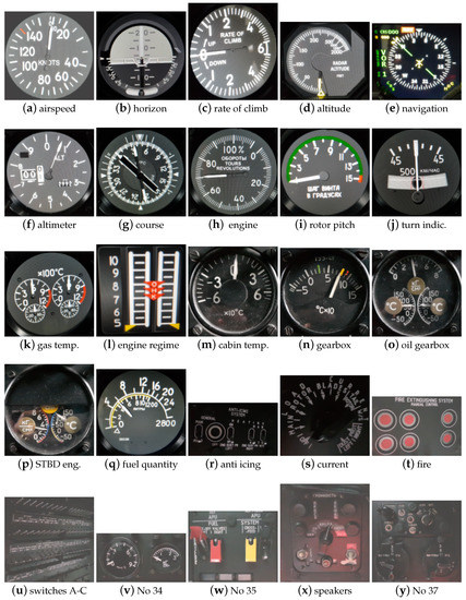 The database creation process was accelerated by recording videos of selected devices instead of taking a series of photos. The recordings were prepared by different technicians, with various cameras being operated to achieve variable conditions for data acquisition. The technical details of the cameras used are given in Table 1. During each recording, particular attention was paid to reflecting the natural movement of the recording device. Thus, this process was performed manually. Additionally, the technicians were asked to add some reasonable motion. It was assumed that each video would start with the object of interest occupying most of the frame, and that the camera would move away throughout the video, finishing with a general overview of the cockpit. This final assumption simplified the work of the automatic film annotation system, which selected the area of the object from each frame and copied it to the final image database. Data collected by each technician were recorded separately, which allowed us to not only examine the recognition ability of the methods but also to infer the impact of data quality on the results. Figure 3 depicts class representatives, while Table 2 summarizes the number of elements describing each object. The data are accessible online at http://wrightbros.lgnexera.at (accessed on 15 May 2019), the details for access are given in Data Availability Statement.