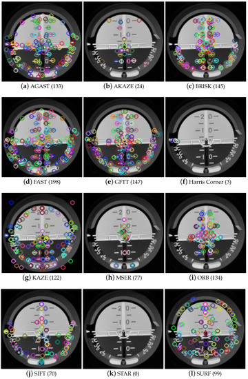 - This method generated the largest amount of keypoints for several images. There were also samples with a low number of characteristic points, but these are comparatively rare; see the example in Figure 5f.