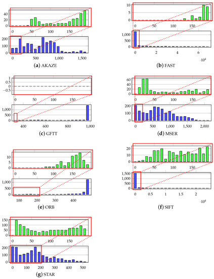 In SIFT [26,27,28,29], the difference of Gaussian operator is applied to define the pyramid levels. Non-maximal suppression is used to find the extrema. Chosen extrema are then validated by whether they depict a valid corner or by verifying the curvature derived from the Hessian matrix. AKAZE (Accelerated KAZE) [30] detects the keypoints by comparing the gradients of small image patches rather than points themselves. MSER (Maximally Stable Extremal Regions) [31] starts the search for extremal regions by ordering the image pixels according to their intensity. The pixels are then placed in the image and a list of connected components and their areas is calculated. Next, intensity levels that are the local minima of the rate of change in the area function are selected as the threshold for producing MSER.
