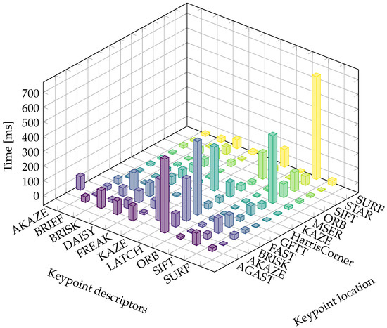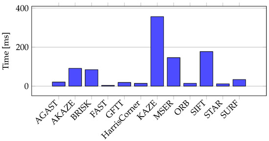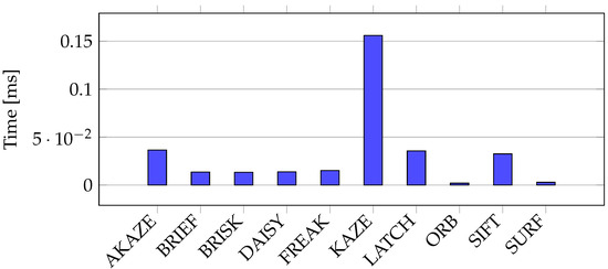 The Oxford University Database was also used to perform experiments addressing the time necessary to obtain keypoint locations. Figure 6 shows the significant differences in time performance. The bar plot presents the average time needed to compute one keypoint considering all the points detected by each method. Since the number of detected keypoints per image is relatively large, the influence of system interruptions can be neglected when considering the whole database. Considering the required time efficiency, the execution times recorded in our experiments excluded the use of the KAZE, SIFT, MSER, AKAZE, and BRISK algorithms as keypoint detection algorithms.