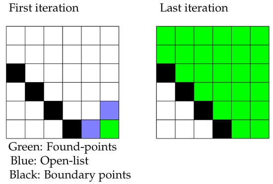 A candidate heuristic process are Flood Fill Algorithms (FFAs) that propagate through maps or networks in order to discover all positions within a connected surface or graph. The pseudo-code for two dimensional pixel maps has been presented in Algorithm 1 and accompanied by Figure 1.