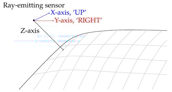 A point source has been placed with a given stand-off from the surface in the normal direction, and a ray is then generated to intersect with the surface from which the tangent directions have been extracted. The 3D analogue of moving in the 2D principle directions is given by approximating the local surface covered by the sensor array with a tangent plane, defined by the observed points and approximate normal direction. Given a surface normal, the principal axes corresponding to `UP’ and `DOWN’ directions have been calculated through the Gram–Schmidt orthonormalization process []. Given a normal vector , and principle directions , and , the smallest component has been selected as basis direction;