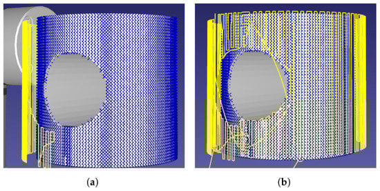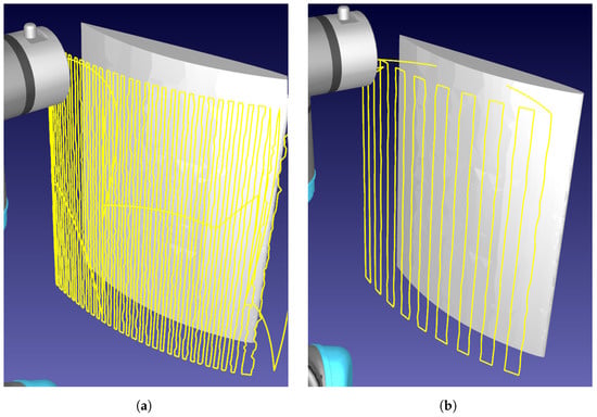 Demonstration of rasterizing a curved aerofoil component. The robotic path is traced in yellow, demonstrating the raster-like path obtained. (a) Sampling distance: 3 mm. (b) Sampling distance: 10 mm.