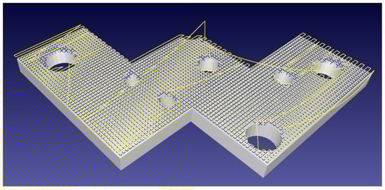 A complex flat plate holed with differently sized voids. The robotic path in yellow backtracks to allow for full surface discovery, shown by blue crosses, in the presence of surface-discontinuities.