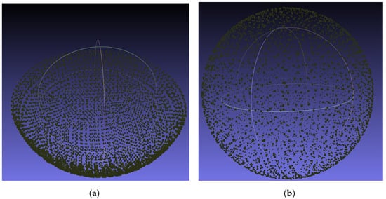 Points discovered while simulating a scan on a bowl and sphere of radius 150 mm with a sampling distance of 3 mm. (a) Concave shape sampling. (b) Sphere sampling.