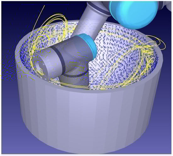 Sampling on a concave shape. The robotic path, that can form irregular patterns without a preferred direction, is shown in yellow. Discovered points on the bowl are shown as blue crosses.