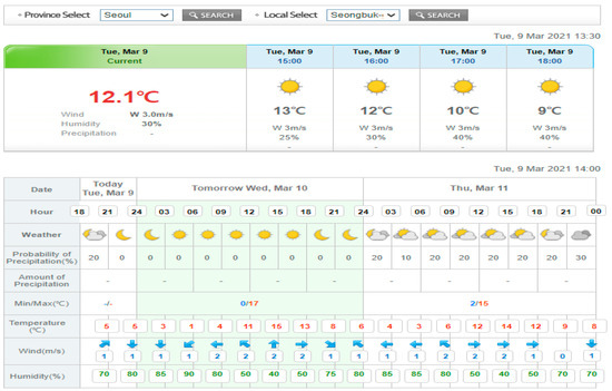 We used the weather data provided by the Korea Meteorological Administration (KMA). The KMA provides weather forecasts for most major areas, including short-term forecasts such as the Dong-Nae Forecast and mid-term forecast. Short-term forecasts provide weather forecasts every three hours for three days from the present day. As our goal is to construct a day-ahead load forecasting model, we collected weather data for the same area as the clusters using the short-term weather forecast. The short-term forecast provides sky conditions, temperature, humidity, wind speed, wind direction, precipitation, and other information. As the predictions are quite accurate, there is little difference between the forecast data and the measured data. An example of the Dong-Nae forecast is illustrated in Figure 1.