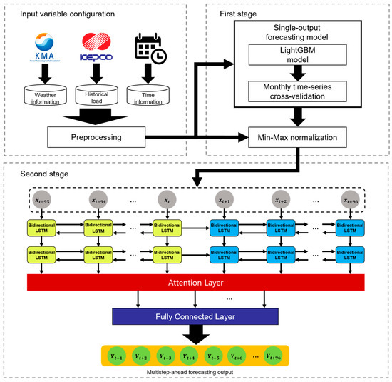 In this section, we describe our two-stage MSA electricity load forecasting model. Figure 3 illustrates the overall architecture of the model. In the first stage, the LightGBM-based forecasting model performs a single-output prediction. LightGBM is a popular ensemble learning algorithm. In the second stage, a forecasting model based on bidirectional LSTM of the S2S architecture and the attention mechanism performs MSA prediction. We used data from January 2015 to December 2018 as the training set and data from January 2019 to July 2020 as the test set. The training set and test set are about 71.75% and 28.25% of the total dataset. The details are described in the following subsections.