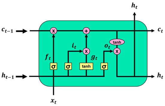 Traditional RNNs are trained using backpropagation through time [46]. However, RNNs can exhibit the vanishing gradient problem for longer sequences of inputs [47]. LSTM [48], which was designed to mitigate this issue, is made by adding three gates to each cell of traditional RNNs. The three gates are input, forget, and output. Figure 5 illustrates the architecture of the LSTM, and the LSTM cell calculation at time for input is given by Equations (4)–(9). Here, g is an update step, and c and h indicate the cell memory state and hidden state, respectively.