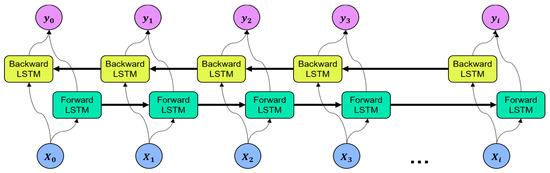 LSTM stores the information of the input data in a hidden layer by adding the concept of time series. However, as the input information is stacked in the time sequence at the hidden layer, the most recent input information is reflected in the result [49]. Bidirectional LSTM (BiLSTM) is an extended version of the traditional LSTM that considers past and future states to improve forecasting performance [50]. BiLSTM processes data into two networks, i.e., the forward LSTM and the backward LSTM, and the outputs of the two networks are merged at each time step. The architecture of the BiLSTM is illustrated in Figure 6.