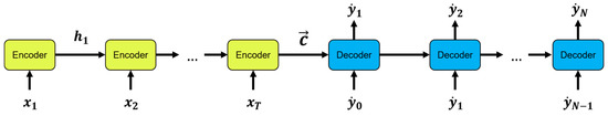 An S2S RNN contains two RNNs, an encoder and a decoder, as shown in Figure 7. The general idea is to pass an input sequence vector one time step at a time to the encoder RNN to obtain a context vector. A common approach is to use an encoder RNN, as given by Equations (10) and (11).