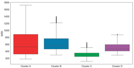 As our forecasting model is composed of two stages, each with a different predictive model, we performed comparative experiments for each model. In the experiments, we used electricity load data collected from four building clusters of a private university in Seoul, Korea, at 15 min intervals through the i-Smart system. The clusters were determined based on their use and location. We first investigated the electric load characteristics of four clusters via box plot and various statistical analyses, as presented in Figure 8 and Table 2. For statistical analysis, we used the descriptive statistical data analysis tool of Excel.