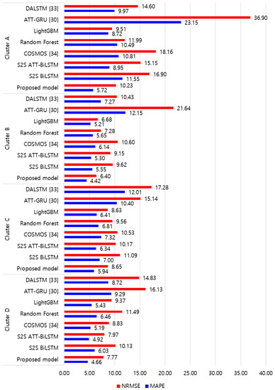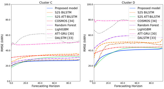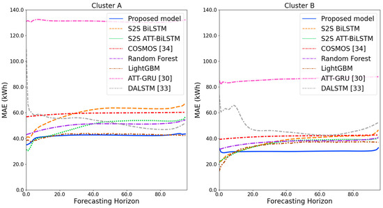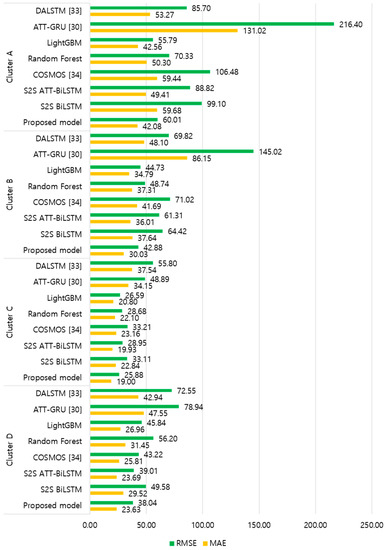 Figure 9 and Figure 10 illustrate the average of the four evaluation metrics of the forecasting models for each cluster over the entire forecasting horizon. For instance, we can see that the proposed model achieved the best NRMSE and MAPE across all clusters, with one exception, as shown in Figure 9. That is, the LightGBM-based forecasting model achieved the best NRMSE in cluster A with a narrow margin compared to the proposed model. Similarly, the proposed model achieved the best performance for MAE and RMSE across all clusters, with one exception, as shown in Figure 10. The LightGBM-based forecasting model achieved the best RMSE in cluster A with a narrow margin compared to the proposed model. Furthermore, from the evaluation results of S2S BiLSTM, S2S ATT-BiLSTM, and the proposed model, it can be seen that attention and two-stage forecasting can improve the forecasting performance. Figure 11, Figure 12, Figure 13, Figure 14, Figure 15, Figure 16, Figure 17 and Figure 18 show the trends of the metric values of the forecasting models over the entire forecasting horizon for clusters A, B, C and D. In the figures, the X-axis represents forecasting time points, and the Y-axis represents their forecasting errors.