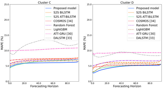 MAPE results of clusters C and D over the entire forecasting horizon (%).