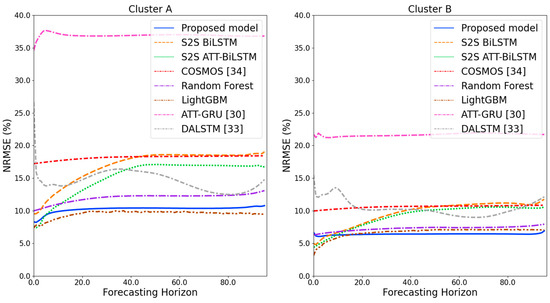 NRMSE results of clusters A and B over the entire forecasting horizon (%).