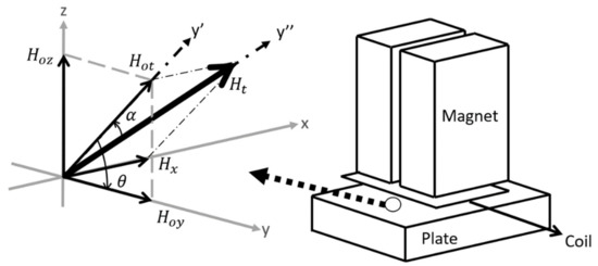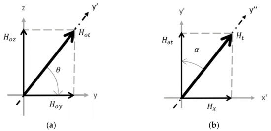 From Figure 3, the PPM array produces two major static field components: the y-component () and the z-component (). (The x-component is insignificant in terms of generation of SH waves and neglected from the calculation.) There are three coordinate systems: x-y-z, x’-y’-z’, and x”-y”-z”. The basis vectors of the x”-y”-z” system are in the three principle strain directions, while the x’-y’-z’ system is an intermediate system between the x-y-z and x”-y”-z” systems. The total static field vector is represented by its magnitude and directional angle in the y-z plane (Figure 4a); the total field (static field plus dynamic field) can be represented by its magnitude and directional angle (Figure 4b). A 3D diagram of both coordinate systems along with one side of a PPM EMAT is depicted in Figure 5. The angles can be defined as