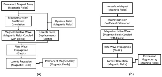 After the transmitter simulation is complete, the displacements are inserted into a wave propagation simulation containing only the plate to find the displacements at the PPM EMAT receiver. Finally, those displacements are used for the PPM EMAT receiver simulation to find the receiver voltage. The block diagrams of the simulation processes are shown in Figure 7.