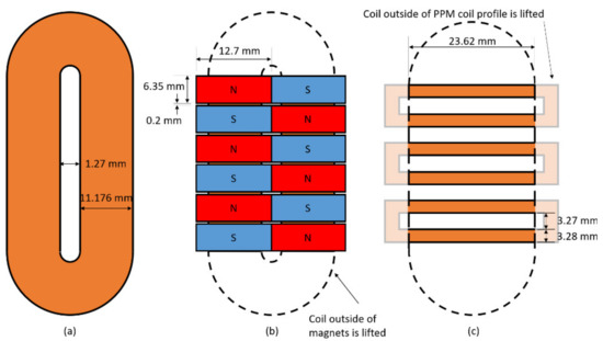 Overhead View and Dimensions of each EMAT Configuration. (a) Racetrack coil (PPM with Magnets Removed); (b) PPM EMAT; (c) Meander coil in the MS-EMAT transmitter. “Lifted” portions of coils are sufficiently distant from the test plate that they do not participate in the transduction mechanism.