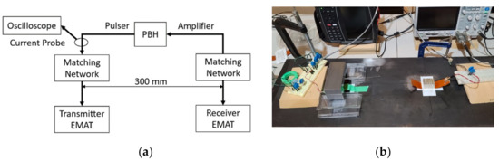 A PowerBox H (PBH) system (Innerspec Technologies, Forest, VA, USA) is used to pulse the transmitter EMATs and amplify the receiver voltage. The input current is measured with a Tektronix P6022 current probe. The PBH is set to time-average the receiver voltage 16 times, with a pulse repetition frequency of 15 Hz. Custom impedance matching circuits are designed to maximize the received signal.