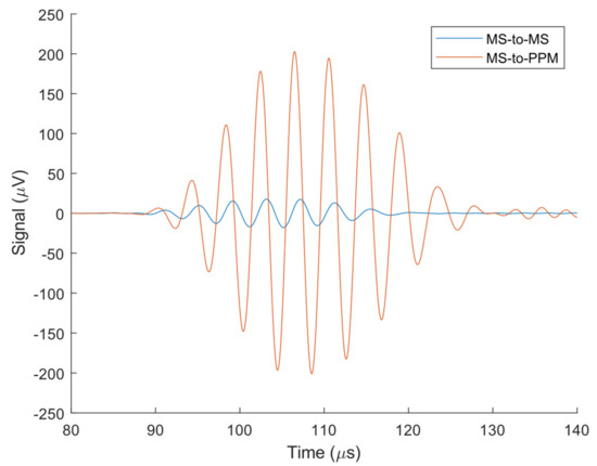 First, the magnetostriction in the PPM EMAT receiver is estimated to determine if it is significant enough to be modeled. An MS-to-MS experiment is compared against an MS-to-PPM experiment with the same MS-EMAT magnet liftoff (8.92 mm) for both transmitter and receiver and input current (35.1 A) in the transmitter (Figure 11).