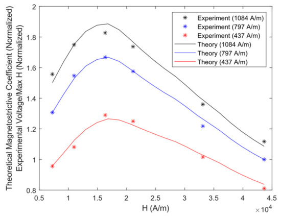 Function of Equation (18) is minimized using MATLAB’s fmincon function to match the calculated coefficient with the experimental voltage divided by the dynamic field as closely as possible. and are found from this step, along with an estimate of and , and the results are shown in Figure 12. Next, function of Equation (19) is minimized with all PPM-to-PPM and one MS-to-PPM simulation as well as experimental data to find the final values of and . The final magnetostriction model factors are tabulated in Table 1.