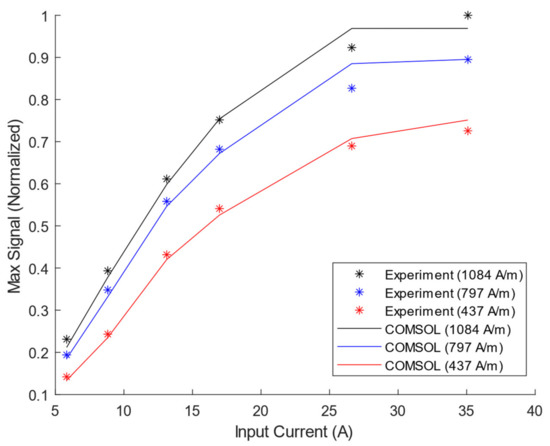 Figure 14 shows the maximum receiver voltage vs. input current for the COMSOL and experimental results for the PPM-to-PPM system. The total COMSOL simulation containing both Lorentz and magnetostrictive contributions has a maximum deviation of 6.3% from the experimental result. The maximum cross-correlation values between the experimental and simulated absolute frequency spectra range from 0.9965 to 0.9972.