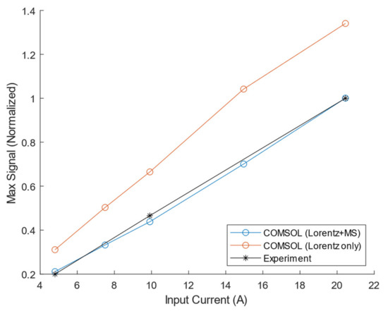 The MS-to-PPM experimental and simulated data are summarized in Figure 13, where the maximum time domain receiver voltage amplitude is plotted against the input current. The maximum relative error of all MS-to-PPM simulation results against experiments is 6.6%. The simulated and experiment frequency spectra have a maximum cross-correlation of 0.9973 to 0.9989 for the entire MS-to-PPM set. Therefore, the FEM model can be considered to accurately predict the magnetostriction within the PPM EMAT’s range of operating conditions. Therefore, the model can estimate the relative strength of magnetostriction and Lorentz mechanisms in the PPM transmitter EMAT in the next section.