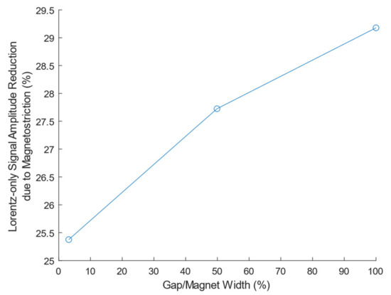 The effect of the relative gap to magnet width in a PPM EMAT transmitter is investigated by simulation. The wavelength, input current, and PPM EMAT receiver geometry remain unchanged, but the PPM EMAT transmitter gap increases by decreasing magnet width. The experimental PPM EMAT is designed with off-the-shelf magnets and has a minimal gap of 3.1% gap/magnet width ratio, which is close to an ideal zero-gap PPM EMAT without ordering custom magnets. The gap is increased for several values (Figure 15), and it is observed that increasing the ratio also increases the magnetostrictive effect on the PPM EMAT transmitter. For example, if the magnet gap is 3% of the magnet width the Lorentz-only signal is reduced by 25.4%. If the gap is increased to 100% of the magnet width (gap equals magnet width), the Lorentz-only signal is instead reduced by 29.2% due to magnetostriction.