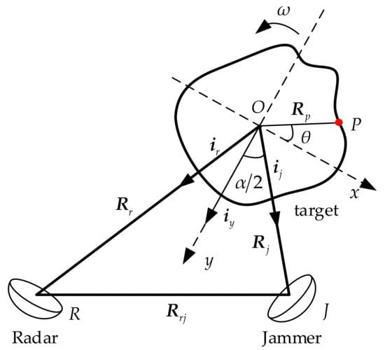 Without loss of generality, the real motion of a target should include translational and rotating parts. However, because the translational component does not contribute to radar azimuth imaging, the target motion model is usually equivalent to the rotating motion model through translational compensation in the ISAR imaging process [,,,]. Based on the above assumption, the spatial geometric positions of the radar, jammer, and detected target are shown in Figure 1. The rotation center of the target is point O. The distance vectors from O to the radar and jammer are  and , respectively, and  is the distance vector between the radar and jammer. The reference coordinate system  is established by defining the bisector of the included angle  between the radar and the jammer as the y-axis. Taking point P on the target as an example, the position vector with respect to O is . The initial angle between  and the x-axis is . The rotational angular velocity of the target is .