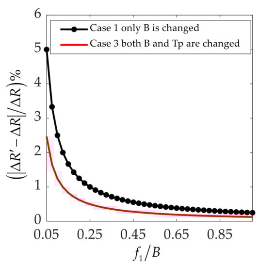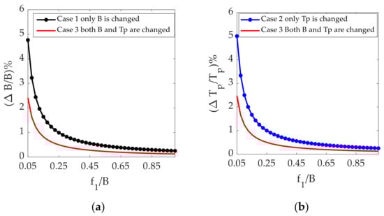 In Figure 3a, the black dotted curve represents the ratio of the bandwidth variation to the original bandwidth of the signal at different sampling frequencies in case 1, where only B is changed. The red curve represents the ratio of the bandwidth change to the original bandwidth of the signal at different sampling frequencies in case 3, where both B and Tp are changed.
