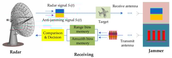 Figure 5 shows a schematic diagram of the proposed anti-jamming technique, which is based on traditional ISAR systems. The transmitting process includes the original radar signal  and the anti-jamming signal  which can be transmitted and received through two channels individually and synchronously without jamming. Effective signal separation can be achieved when the signal bandwidth has a different frequency range. When the bandwidths of the two signals partially overlap, the two signals need to be designed differently by combining the transmitted pulses. For example, pulse diversity technology or sub-pulse technology can be used to transmit two signals using different pulse sequences or sub-pulses, which are then separated at the receiving end of the radar to ensure that the two signals do not jam each other.
