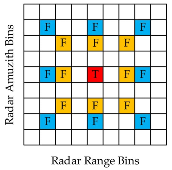 In Figure 6, T represents the true target and F represents the false target. A comparison of the imaging results for the two signals shows that the true target stays in the same range and azimuth bins, while the false target appears in different range and azimuth bins and can therefore be distinguished from the true target by judging the spatial position characteristics of the targets.