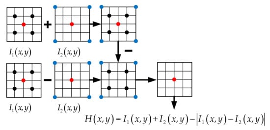where  and  are the imaging results corresponding to the two signals. First, the two imaging results are summed. Secondly, the two imaging results are subtracted and the absolute value is taken, and the absolute value is subtracted from the sum result to get the final suppression result. Thus, the cancellation of false targets and the reservation of real targets can be achieved. The flowchart for the spatial location identification function of the true and false targets is shown in Figure 7. The red dots represent the real target, while the black and blue dots represent the false targets generated by two different jamming signal channels.