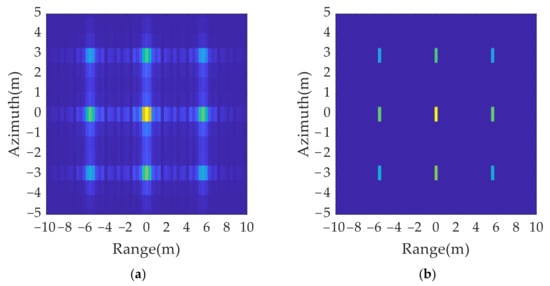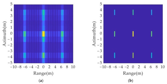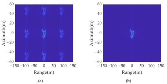 According to the true and false target discriminant function proposed in this paper, a set of jamming suppression results were obtained based on Figure 9a and Figure 12a, as shown in Figure 13a. It can be found that the amplitude of the false target was greatly reduced, but because of the influence of the side lobe, there was still a residual shadow around the false target position, which affected the judgment of the real target position. The jamming suppression results after eliminating the sidelobe were obtained based on Figure 9b and Figure 12b, as shown in Figure 13b. It can be found that only real targets were retained in the inhibition results, which ensured the accuracy of the identification of real and false targets.