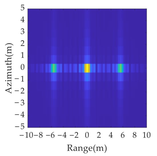 Through the above analysis, the spatial position distribution of the 2D spatial false target generated by the 2D ISRJ can be obtained. The distance of the false targets in the range dimension  is determined by the sampling frequency  of the interrupted sampling function in the fast time domain, chirp rate, and bistatic angle . The distance of the false targets in the azimuth dimension  is determined by the sampling frequency  of the interrupted sampling function in the slow time domain, the target’s equivalent angular velocity of rotation , the carrier frequency of the radar transmitted signal , and the bistatic angle .