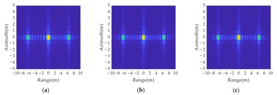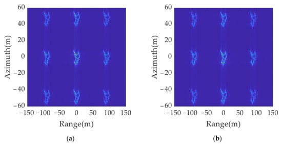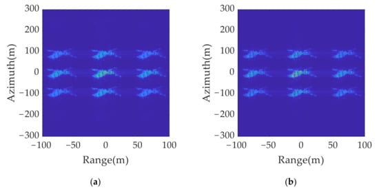 The imaging results for the original transmitted signal and anti-jamming signals are shown in Figure 15. A comparison of Figure 15a,b shows that, although the false target moves by a resolution unit in the range and azimuth dimension, the distribution range of the multi-point false target is much larger than the resolution size. Thus, the true and false target movement cannot be directly judged by using the two imaging results.