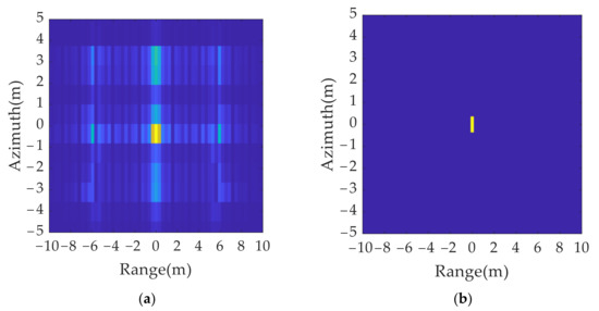 As revealed in Table 5, the entropy of the results without eliminating the sidelobe in Figure 13a is 0.4978 dB and the RMSE is 2.1302. After performing the sidelobe elimination, the entropy in Figure 13b decreased to 0.4302 dB and the RMSE decreased to 0.1684, which means that the false targets are completely eliminated, and the true target is retained.